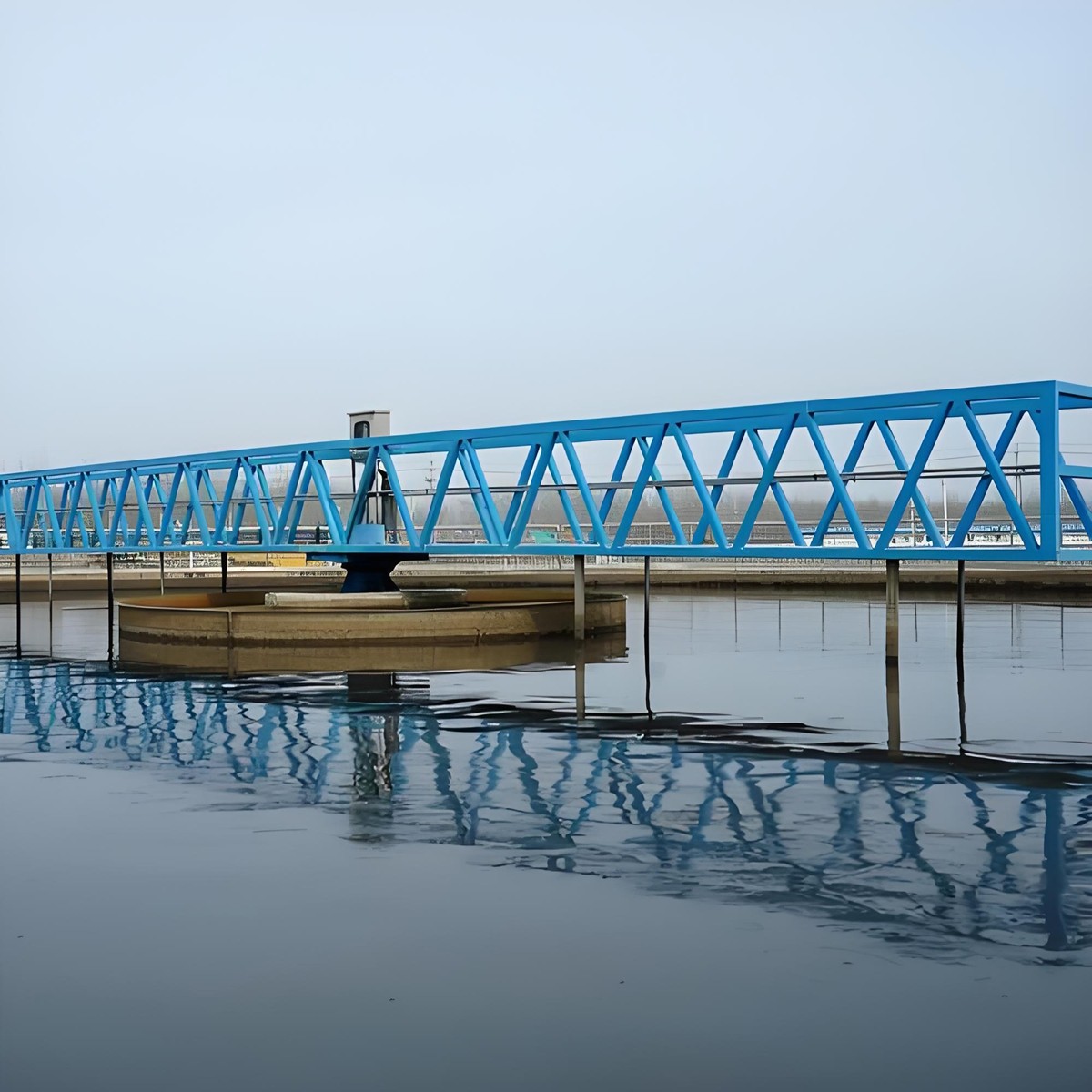The drive unit is mounted at the center of the working bridge. It rotates the vertical shaft and the attached scraper arms. As the arms rotate, the specially angled Scraper Blades sweep the settled sludge from the tank bottom toward the central sludge pit for discharge. The Influent enters through the central Influent Well to ensure steady flow distribution.
