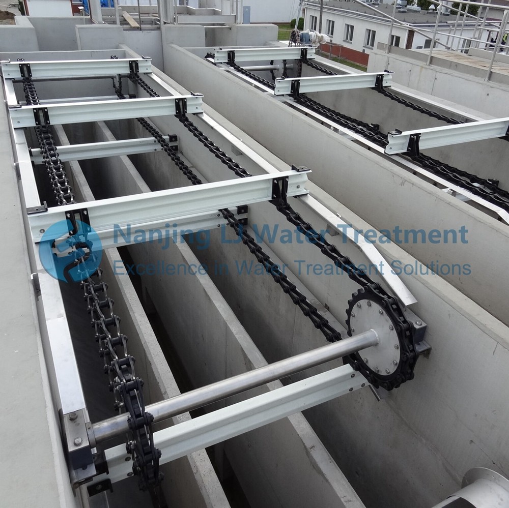 Driven by a gear reducer and suspended transmission system, the scraper blades are pulled by chains to move continuously or linearly along the tank bottom. Settled sludge is gently conveyed to a central sludge trough or hopper and discharged by hydrostatic pressure or pumps.